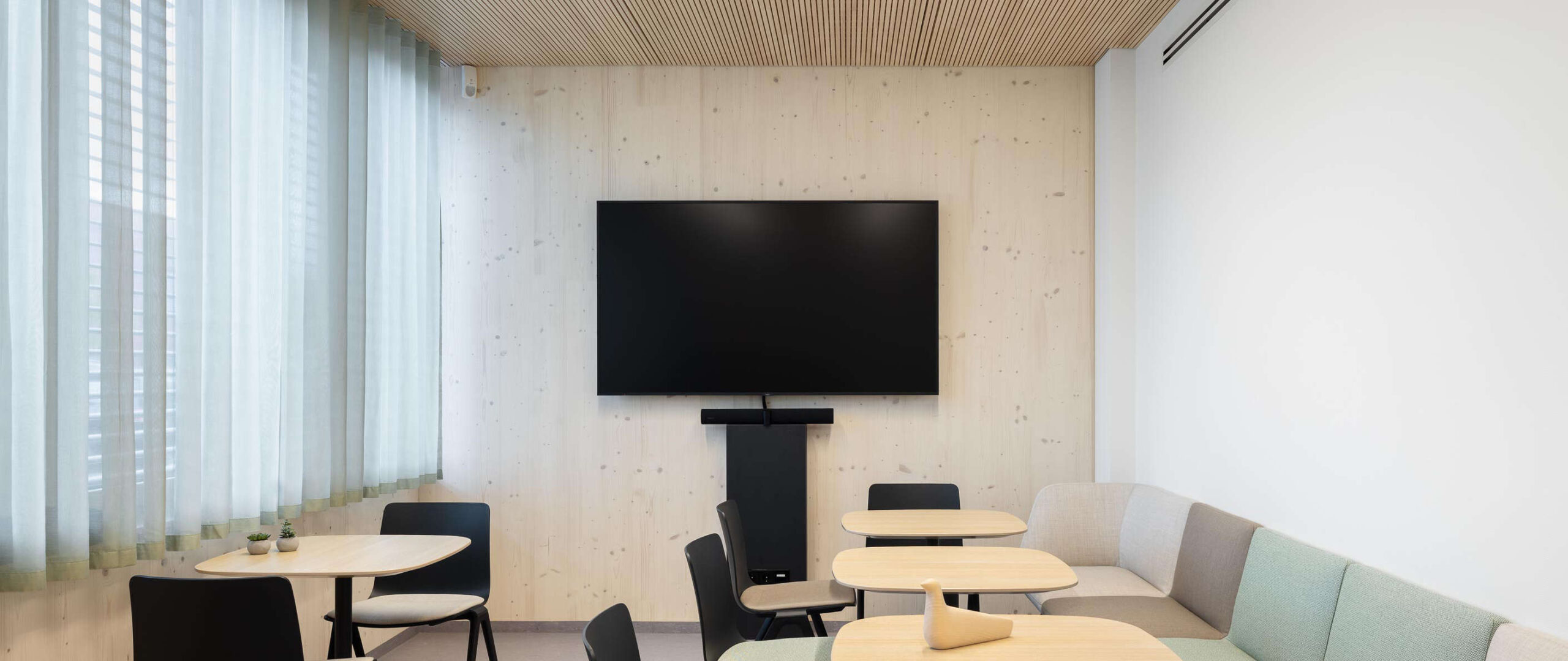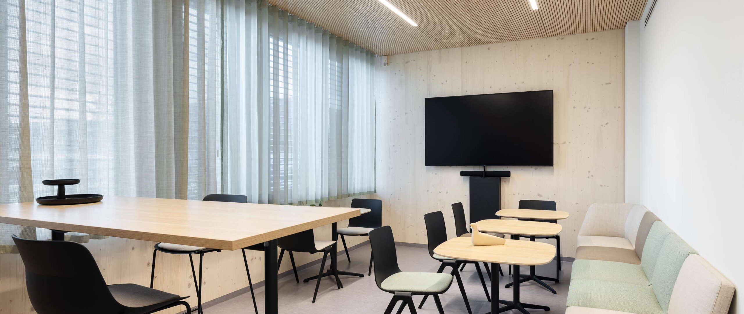 Die Konstruktion des Gebäudes basiert auf Stützen und Unterzügen aus Brettschichtholz. Wände, Decken und das Flachdach sind in Massivholz – in hbwCLT – ausgeführt. Die sichtbaren Wände in Wohnsichtqualität aus heimischer Fichte verleihen den Innenräumen eine natürliche, warme Atmosphäre und betonen den regionalen Charakter des Projekts. Ergänzt werden sie durch abgehängte Akustikdecken aus astfreier Weißtanne, die nicht nur zur Raumakustik beitragen, sondern auch das harmonische Erscheinungsbild abrunden.