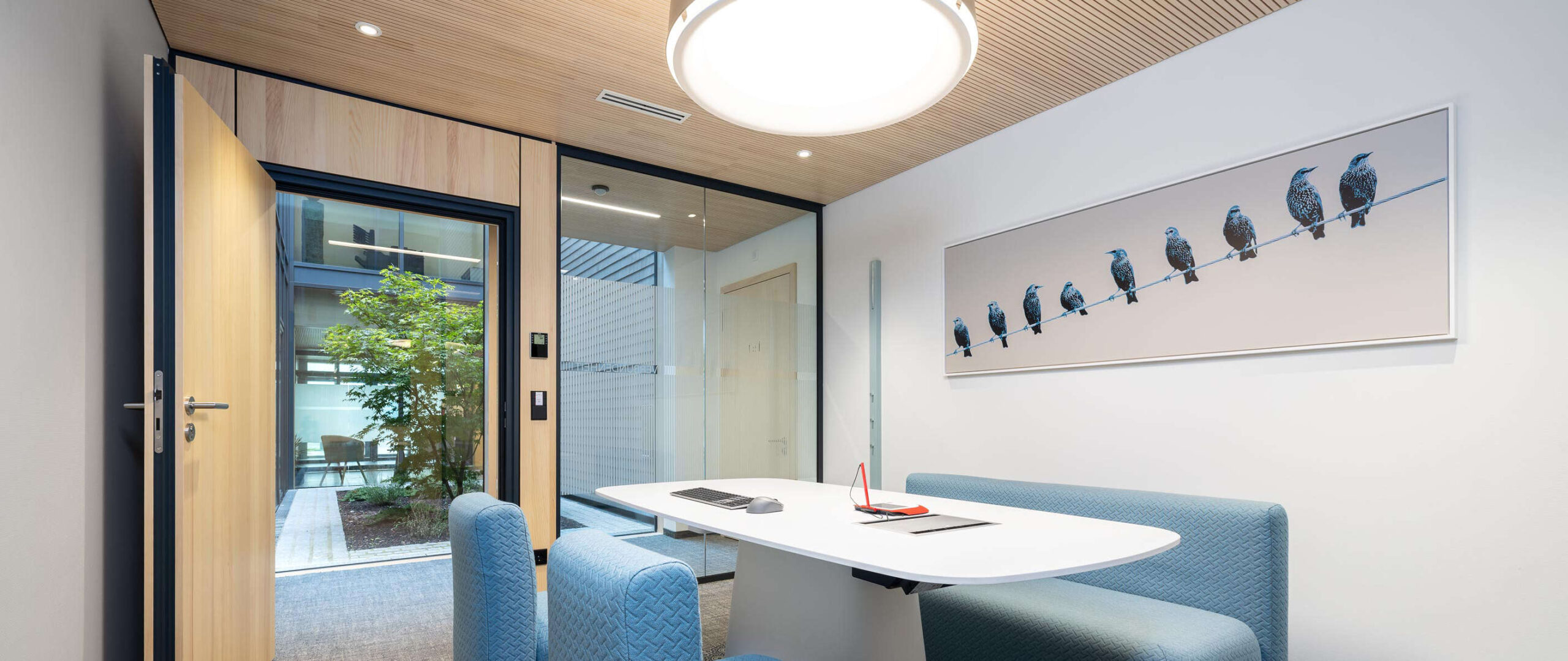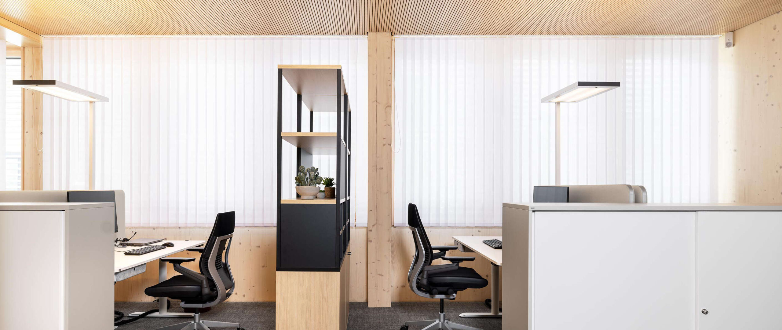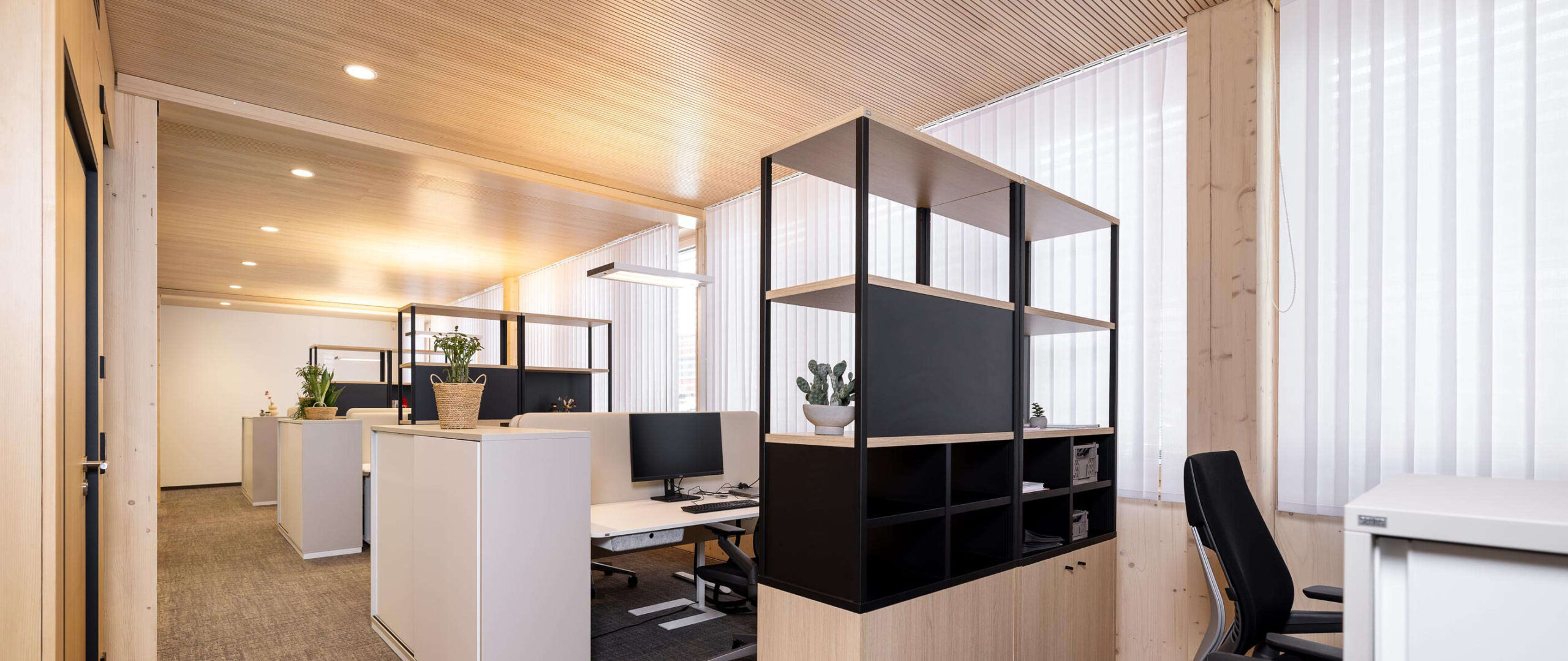 Das Zusammenspiel von moderner Holzbauweise und bewusst gewählter Materialehrlichkeit schafft eine zeitgemäße Arbeits- und Beratungsumgebung mit hohem architektonischem Anspruch.